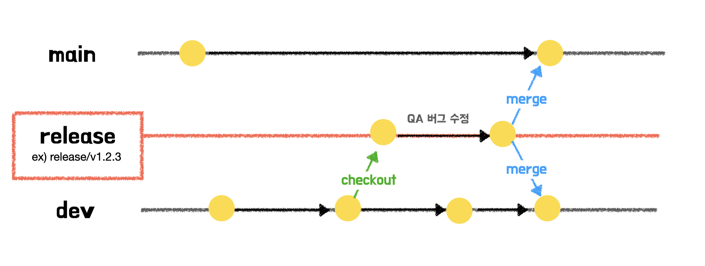(QA 진행시 변경된 코드를 dev 브랜치에도 반영해야하기 때문이다.)