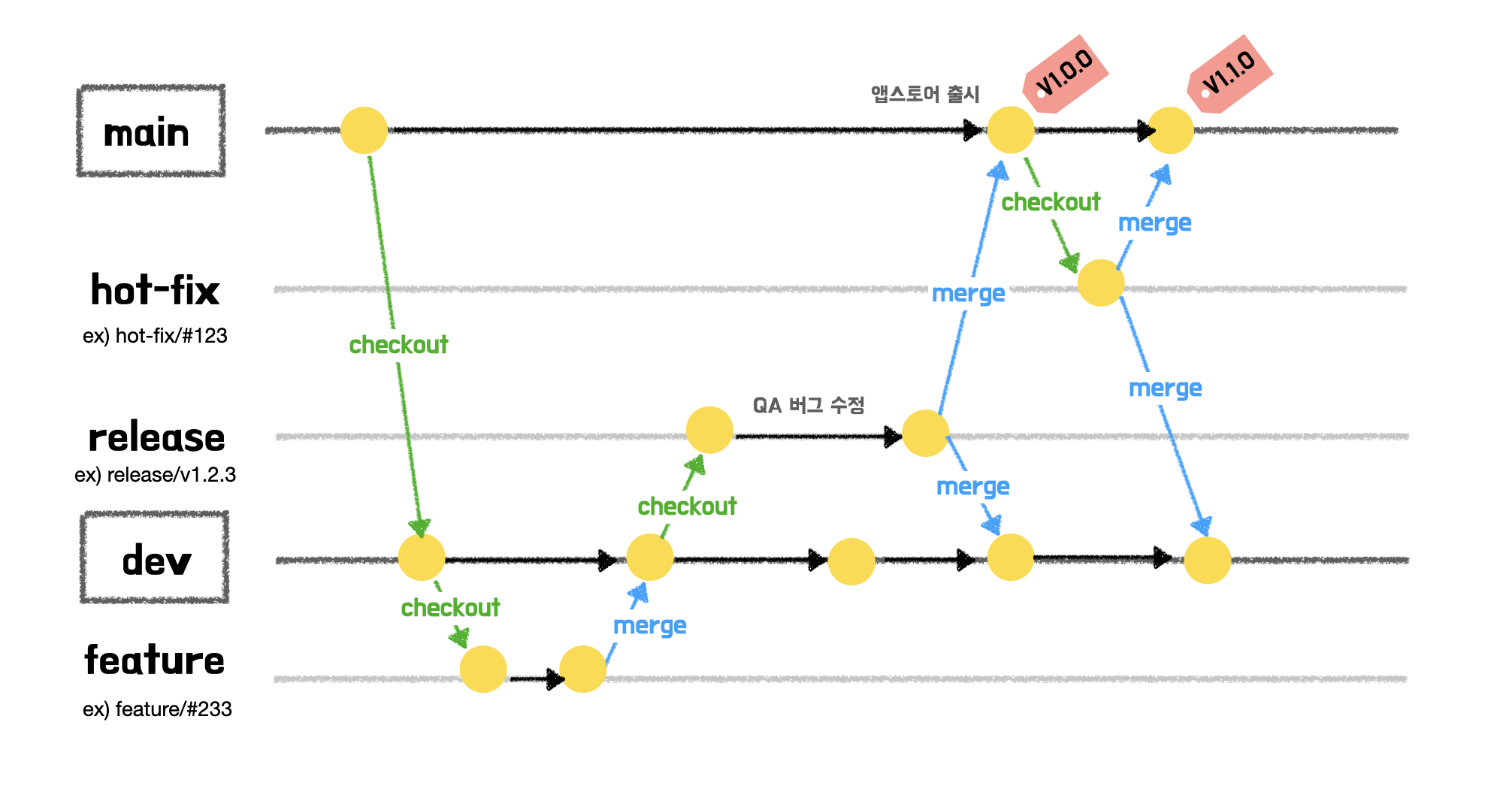 (참고로 우리 팀도 git-flow 전략을 그대로 따르지 않았다.)