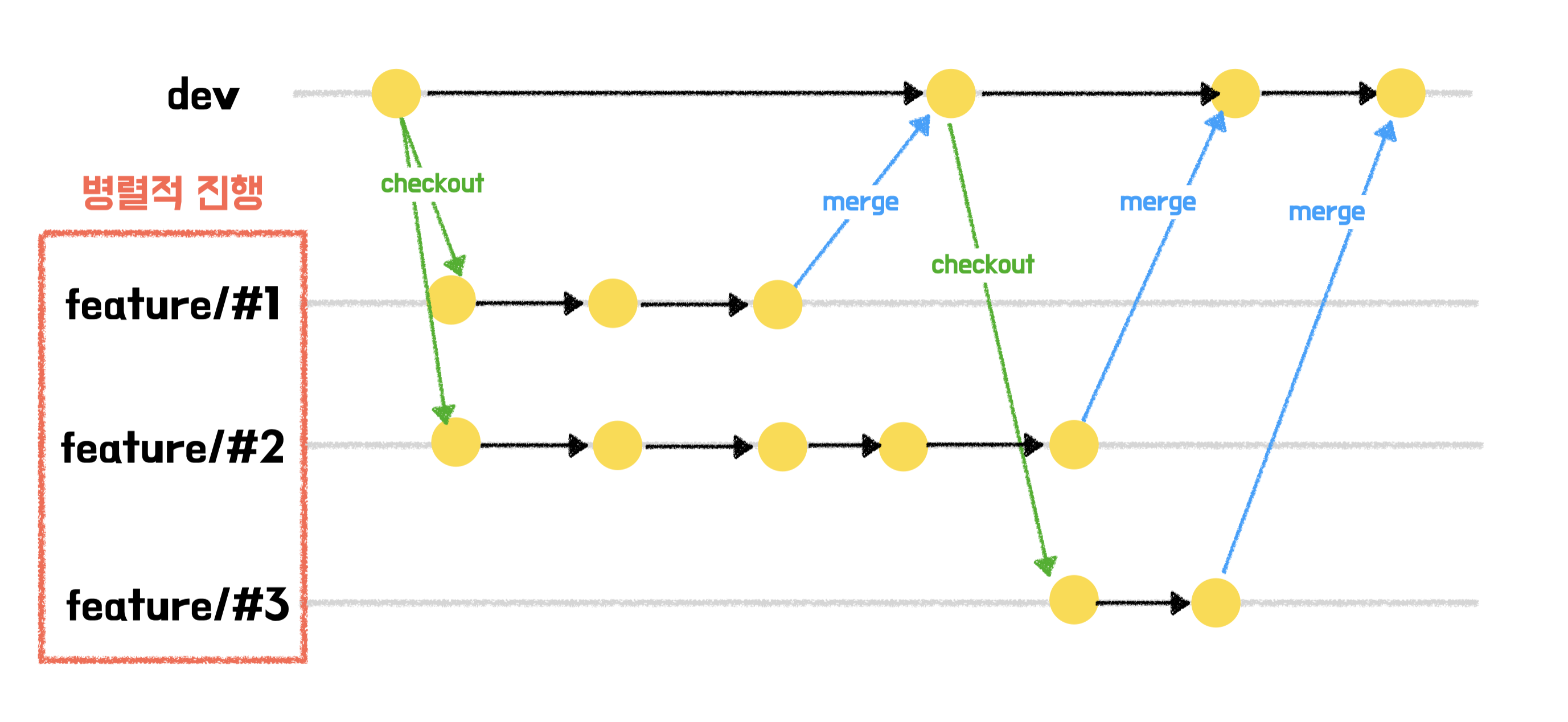 기능별로 다른 feautre 브랜치로 분기해 작업함으로써, 여러 기능을 병렬적으로 작업할 수 있다.