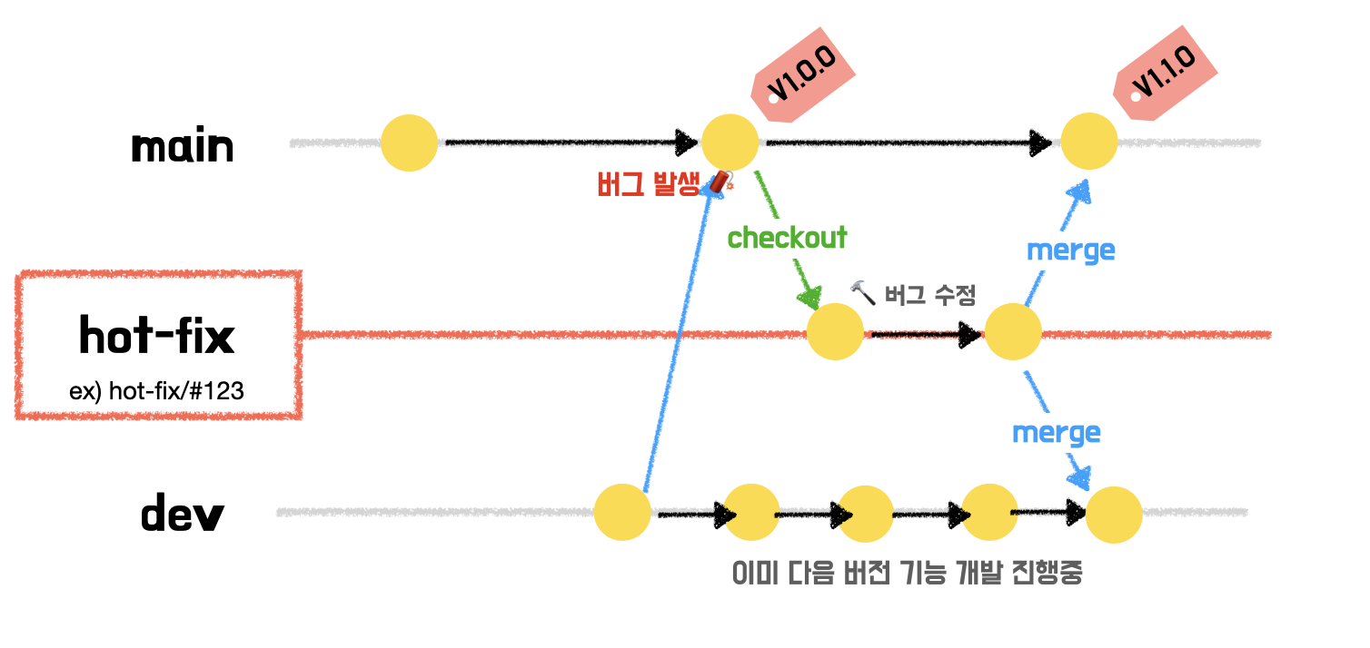 이는 main 브랜치에서 분기되며, 버그 수정 후 main 브랜치와 dev 브랜치로 머지시킨다.