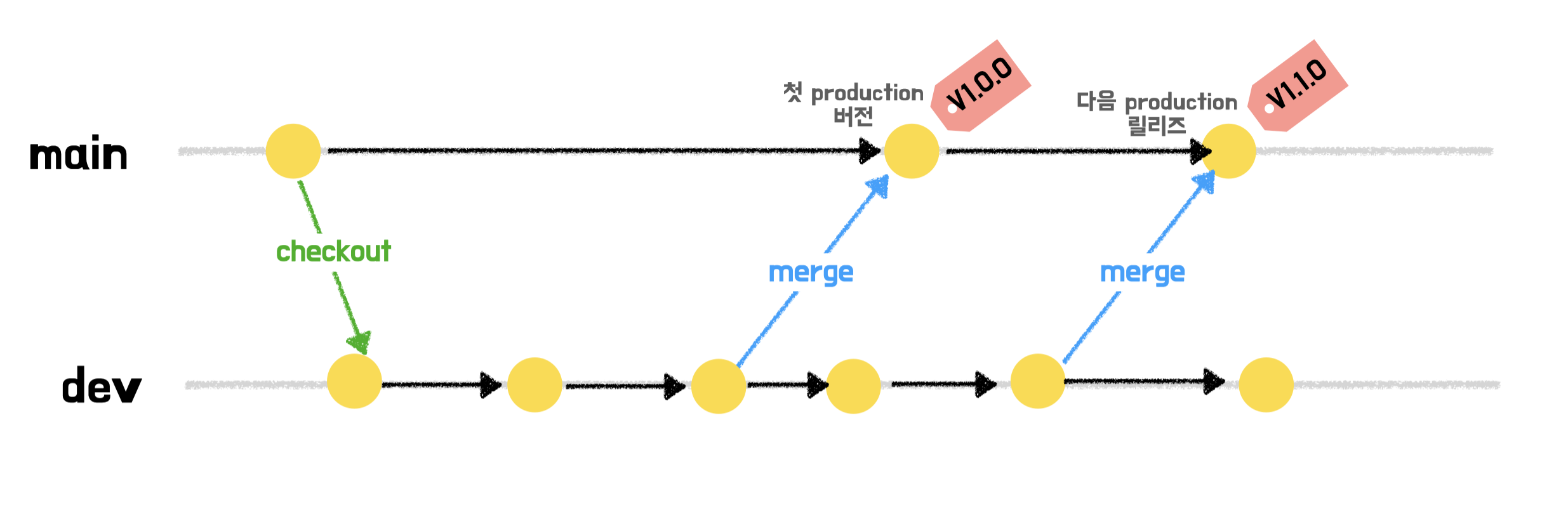 주로 해당 브랜치는 릴리즈 태그가 된 커밋들만 포함된다.