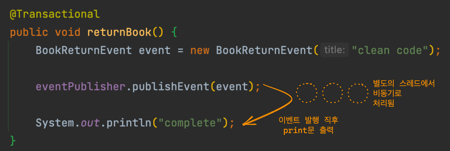 하지만, 이벤트를 활용하면 BookReturnedEvent를 구독하는 리스너만 추가될 뿐, BookReturnService 코드에 새로운 종속성이 추가되거나 복잡성이 증가하지 않는다.